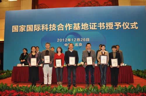 2012年12月26日,“国家国际科技合作基地证书授予仪式”在京隆重举行。科技部曹健林副部长、国际合作司靳晓明司长、马林英副司长、续超前副司长、陈霖豪副司长等科技部领导为获批的国家国际科技合作基地、国家国际联合研究中心颁发了证书。