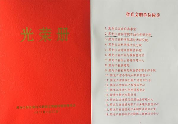 日前,在省直机关文明单位建设评比活动中,石化院被黑龙江省直机关精神文明建设指导委员会授予“省直机关文明单位标兵”荣誉称号。