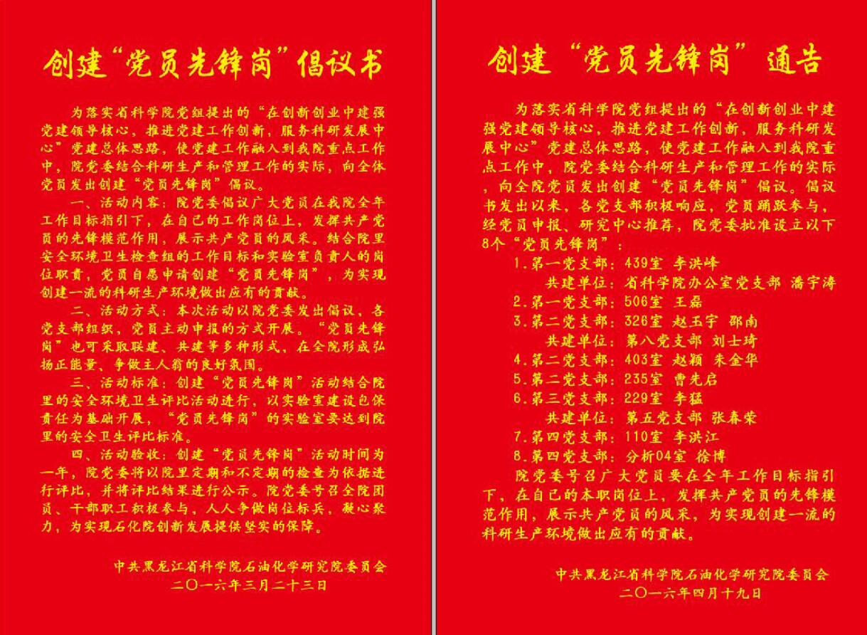 为落实省科学院党组提出的“在创新创业中建强党建领导核心,推进党建工作创新,服务科研发展中心”党建总体思路,使党建工作融入到研究院的重点工作中,石化院党委结合科研生产和管理工作的实际,在“两学一做”学习中,以“做合格党员”为目标,向全院党员发出创建“党员先锋岗”倡议,倡议广大党员在院全年工作目标指引下,在自己的工作岗位上,发挥共产党员的先锋模范作用,展示共产党员的风采,为实现创建一流的科研生产环境做出应有的贡献。