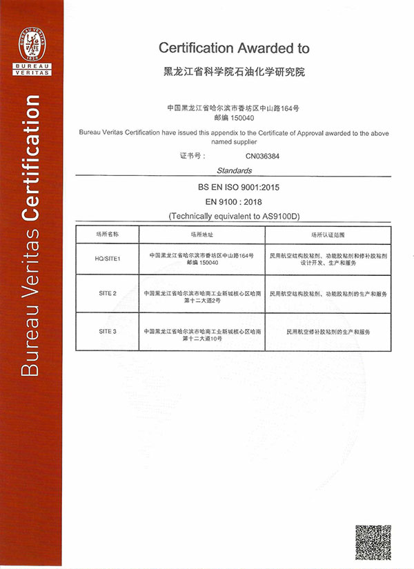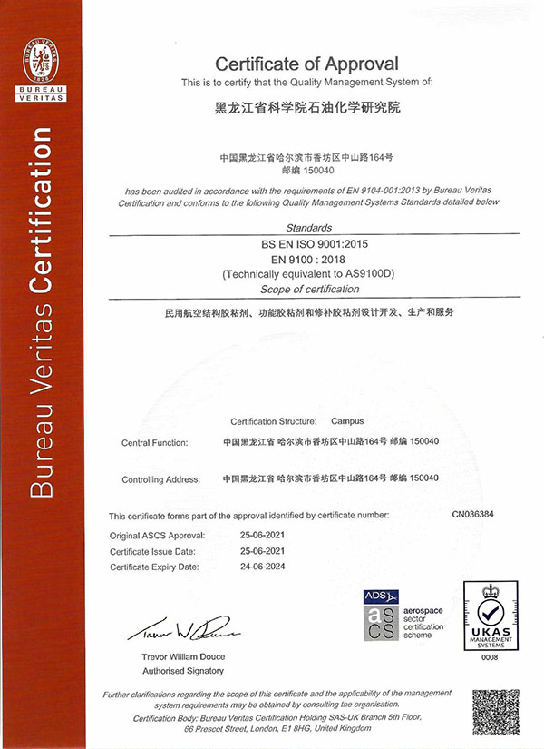 该体系的通过,意味着我院的配套服务领域不断扩大,已打开了航空航天业未利用的国际国内商业的商机之门,建立了我院在质量方面的可信性和承诺,并有助于上下游供应链之间的交流和沟通。该证书的取得,标志着我院的胶粘剂产品已具备进入民用航空领域的资格,我院将把握历史机遇,乘势而上,继续坚定前行,为推动中国大飞机事业贡献我们的力量。